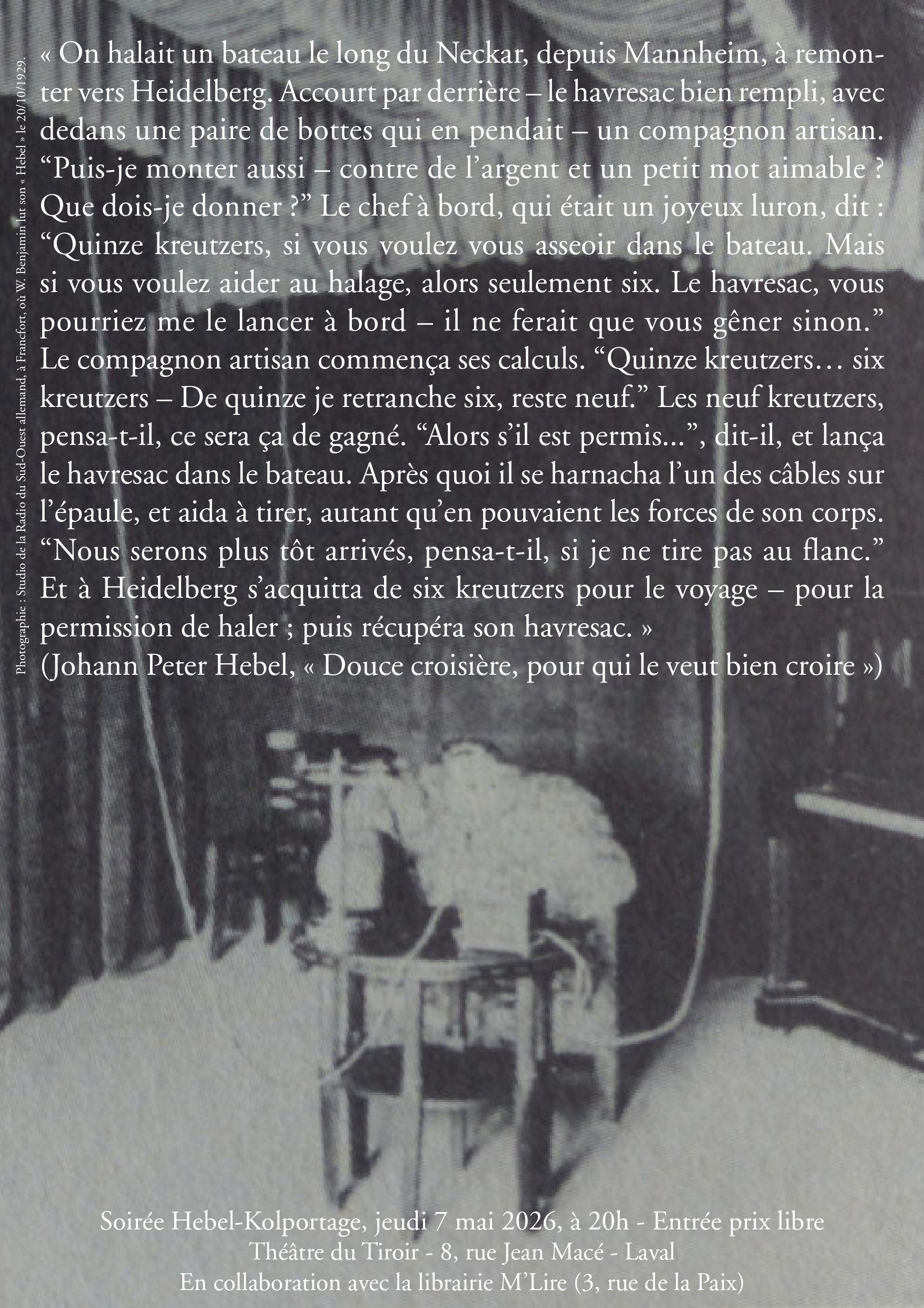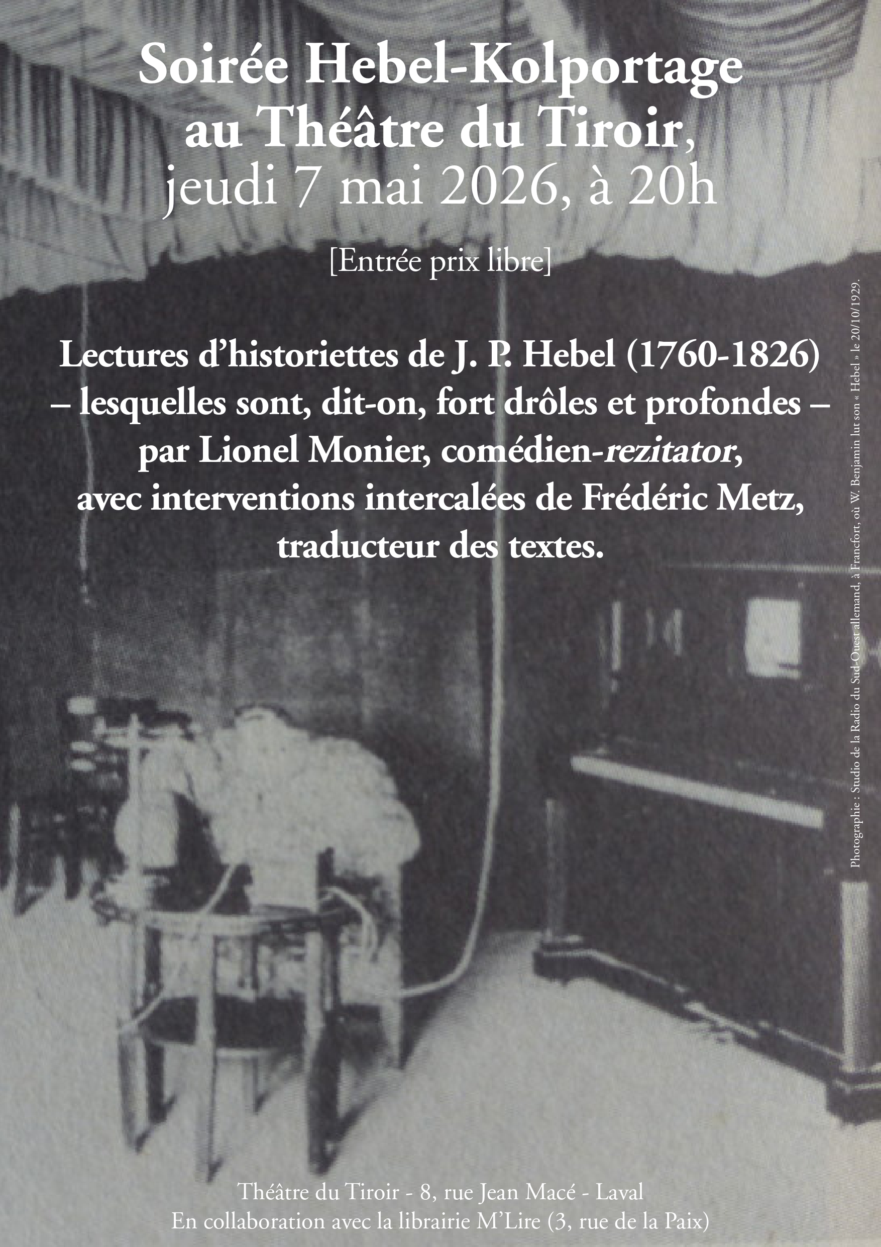 Ce jeudi 7 mai 2026 à 20h, au Théâtre du Tiroir, en collaboration avec la librairie M’Lire, aura lieu une présentation de J. P. Hebel (1760-1826), écrivain allemand très comique, admiré par Kafka, Benjamin, Bloch, Brecht, Heidegger, Wittgenstein…