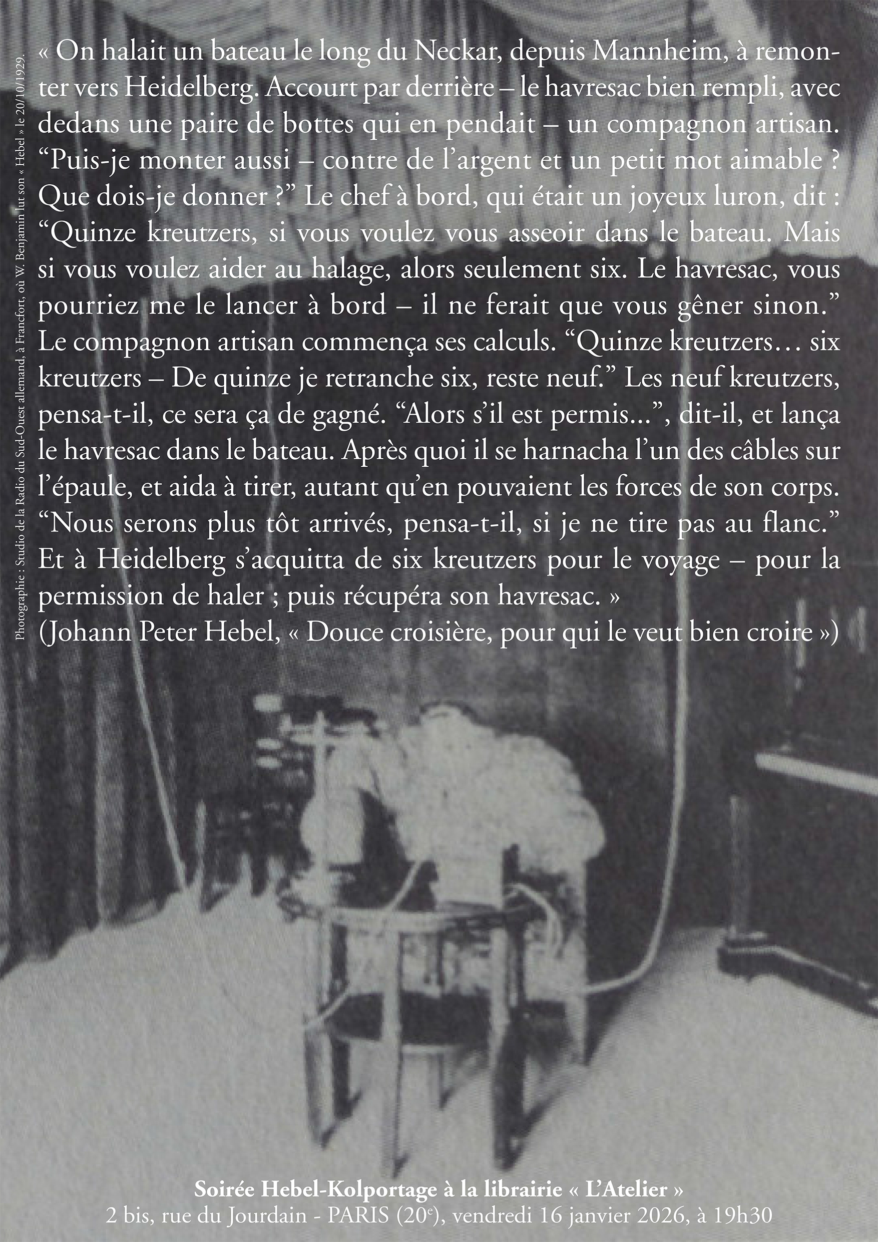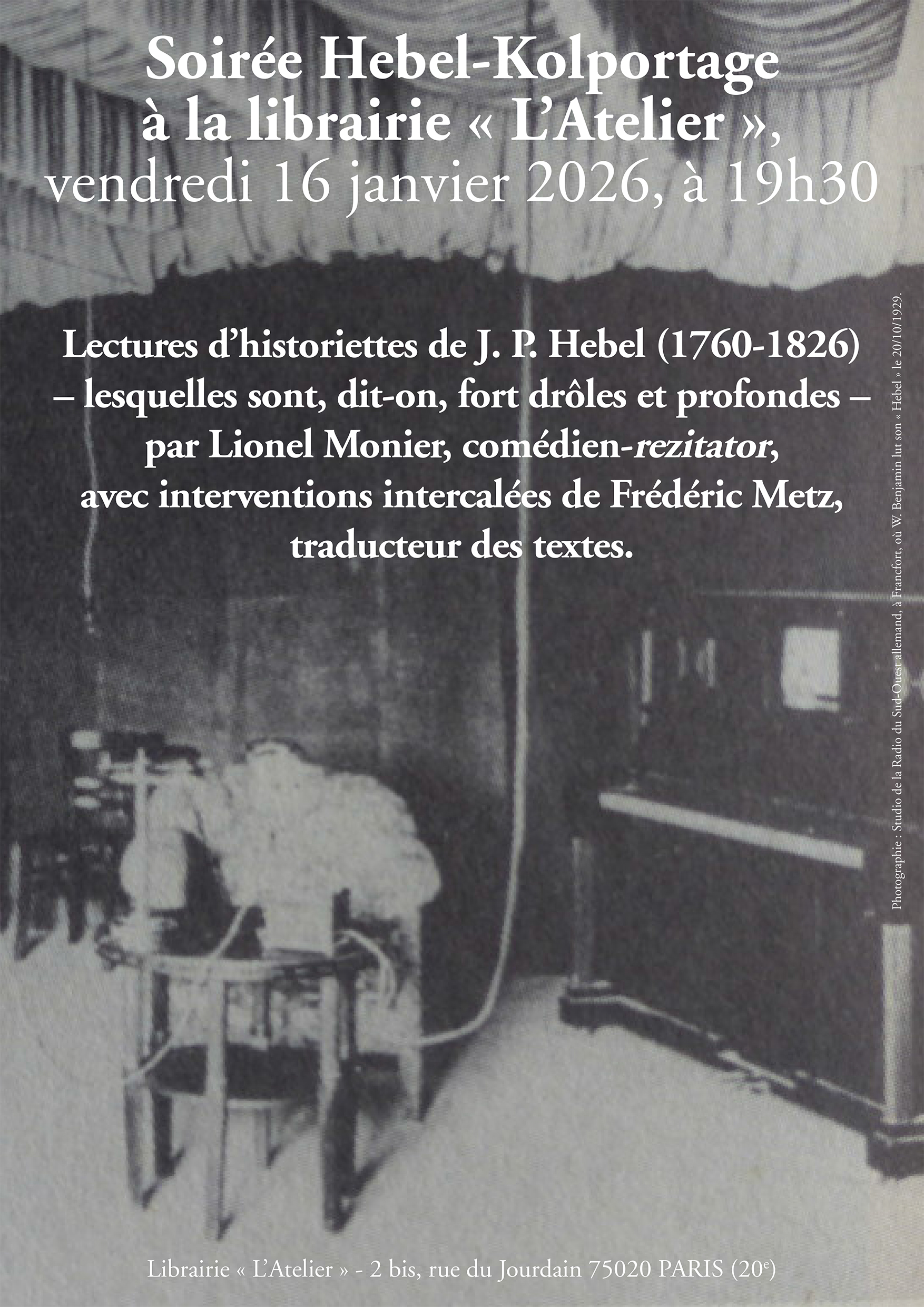 Le vendredi 16 janvier 2026 à 19h30, à la librairie « L’Atelier », aura lieu une présentation de J. P. Hebel (1760-1826), écrivain allemand très comique, admiré par Kafka, Benjamin, Bloch, Brecht, Heidegger, Wittgenstein…